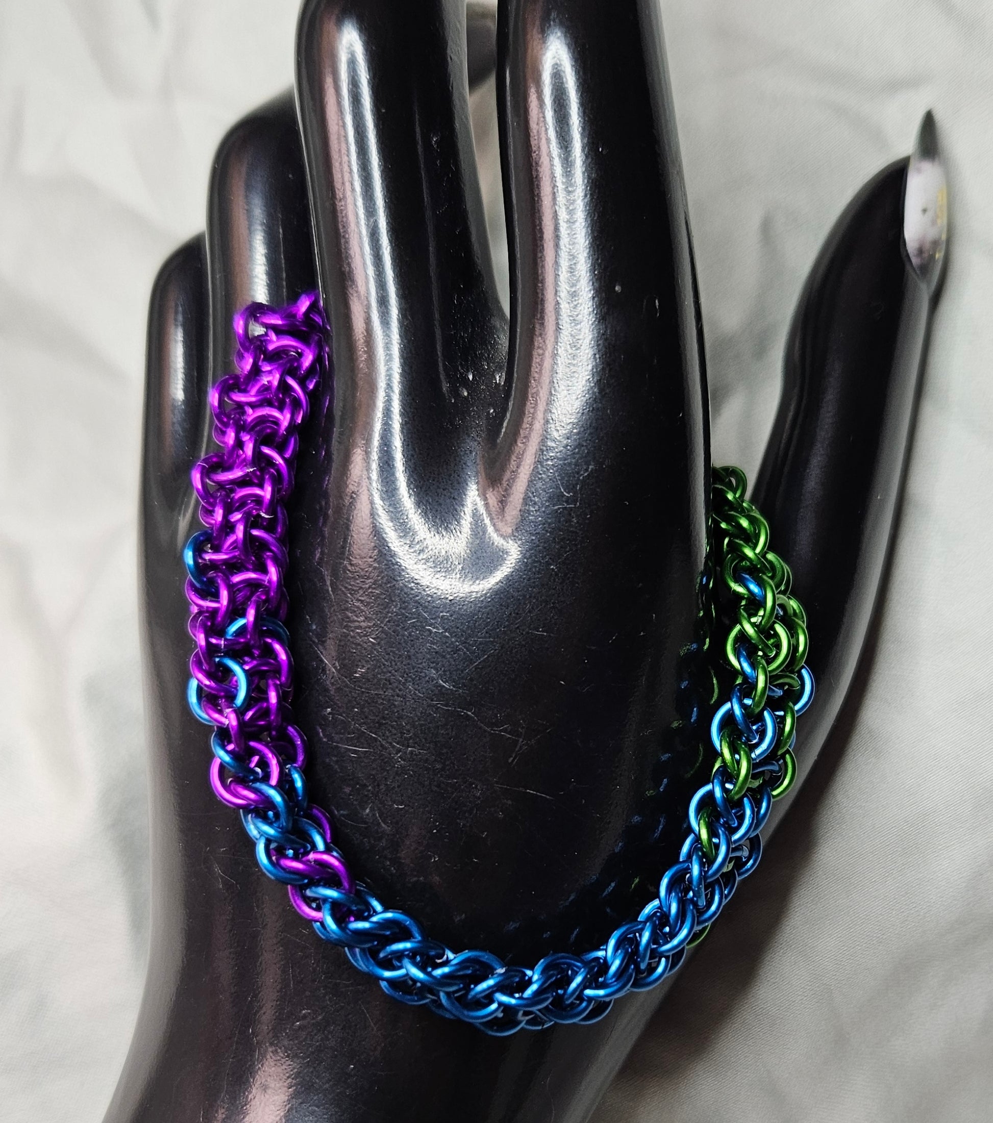 The Vipera Berus Bracelet features a striking alternating pattern that creates a flat, smooth design, making it a perfect statement piece for any occasion. This bracelet combines the intricacy of chainmail with the sleek elegance of anodized aluminum, offering a versatile and stylish accessory.